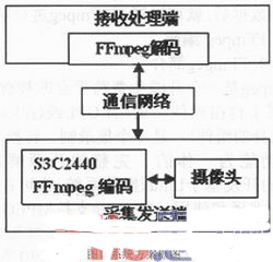 系統(tǒng)是在S3C2440平臺上運行嵌入式Linux系統(tǒng),使用CMOS攝像頭OV9650獲取實時視頻圖像數(shù)據(jù),采用H264標準通過FFmpeg原始視頻進行壓縮編碼成視頻流,通過網(wǎng)絡(luò)傳輸,用戶在接收處理端經(jīng)過FFmpeg解碼之后,使用OpenCV顯示播放即可實時查看遠程視頻圖像。