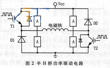懸浮控制系統(tǒng)由DSP、FPGA、A/D轉(zhuǎn)換器、傳感器、功率斬波器和電磁鐵等單元組成??刂频哪康氖潜3蛛姶盆F與軌道之間的距離恒定,為磁浮列車提供穩(wěn)定的支撐。系統(tǒng)結(jié)構(gòu)見圖1。其中A/D轉(zhuǎn)換器采用MAXIM公司的MAX125,它是一種帶同步鎖存的14位4輸入A/D轉(zhuǎn)換芯片,4路同時(shí)工作時(shí)最高采親友速率為76ksps,用于采樣傳感器的輸出信號。DSP采用ADI公司的ADSP2181,用于控制算法的計(jì)算。FPGA采用ALTERA公司的EPF6016,用于產(chǎn)生PWM波和實(shí)現(xiàn)一些輔助功能。傳感器包括間隙傳感器和電流傳感器。功能驅(qū)動(dòng)彩IGBT組成的半H橋網(wǎng)絡(luò),如圖2所示。功率管T1、T2由PWM波形驅(qū)動(dòng)。PWM波為高電平時(shí)導(dǎo)通,低電平時(shí)關(guān)斷,功率管關(guān)斷時(shí)通過功率二極管D1、D2續(xù)流。圖中的A是吸引網(wǎng)絡(luò),防止反沖電壓過高損壞器件。該電路的特點(diǎn)是:當(dāng)一個(gè)周期內(nèi)T1、T2導(dǎo)通時(shí)間小于50%時(shí),電磁鐵上電流為0。