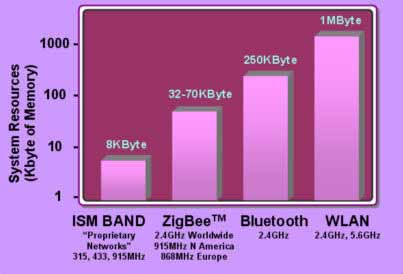 ZigBee協(xié)議相對(duì)較輕巧,它的代碼空間為32-70KB,數(shù)據(jù)傳輸范圍適中,為10-100米。這些特點(diǎn)讓ZigBee成為了工業(yè)網(wǎng)絡(luò)的首選。ZigBee的一大優(yōu)點(diǎn)是其“網(wǎng)狀”能力。網(wǎng)狀網(wǎng)絡(luò)允許節(jié)點(diǎn)間的信息傳輸;這樣一來,就算任何節(jié)點(diǎn)出現(xiàn)故障或掉線,信息也能順利傳輸至目的地。網(wǎng)狀網(wǎng)絡(luò)的數(shù)據(jù)包處理非常復(fù)雜,因此,所需的程序內(nèi)存較大。圖2給出了各無線網(wǎng)絡(luò)的相應(yīng)代碼大小。