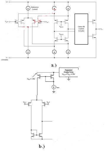 圖1: 互補(bǔ)輸入級、單電源放大器:a);帶一個正充電泵的單差動對輸入級:b)。
