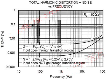 放大器的輸入噪聲是影響THD+N規(guī)范的另一個因素。高級別的輸入噪聲和/或高閉環(huán)增益都會增加放大器的總THD+N水平。