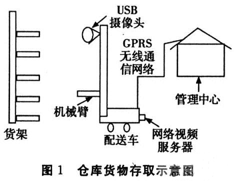 本系統(tǒng)基于USB攝像頭的圖像采集子系統(tǒng),ARM處理器子系統(tǒng)和無線網(wǎng)絡數(shù)據(jù)傳輸子系統(tǒng)組成了視頻服務器系統(tǒng)。通過三星S3C2410開發(fā)板上的GPRS模塊實現(xiàn)了與管理中心的數(shù)據(jù)交互傳輸。通過USB攝像頭接收圖像數(shù)據(jù),實施對貨架位置的定位識別,然后將識別信息通過GPRS模塊設備發(fā)送到配送管理中心。管理中心向配送車發(fā)送控制命令,將配送車上的貨物放置到指定的貨架位置,或從指定的貨架位置上取出貨物,裝載到該配送車。如圖1所示。