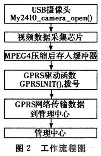 上圖中的網(wǎng)絡視頻服務器主要是由USB攝像頭、網(wǎng)絡視頻服務器等組成。其工作流程如圖2所示。