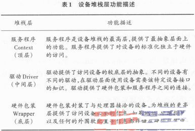 軟件平臺文件(SwPlatform)是在SPB中,從一系列提供的元器件中選擇組合起來的軟件層。軟件平臺文件使得應(yīng)用程序通過一組標準化的服務(wù)來利用硬件,如存儲服務(wù)和網(wǎng)絡(luò)服務(wù)。軟件平臺文件的目的其實就是使硬件設(shè)備通過抽象和通用的軟件接口,來為應(yīng)用程序提供外圍設(shè)備的應(yīng)用編程接口(API)。軟件平臺中的設(shè)備堆棧(Device Stacks)由三種類型的模塊構(gòu)成,分別是硬件包裝(Wrapper)、驅(qū)動(Driver)和服務(wù)程序(Context)。通常從底而上,從最底層的與原理圖設(shè)計上特定硬件設(shè)備相關(guān)的模塊開始構(gòu)建設(shè)備堆棧。在此之上,可以堆積較高層次的模塊,提供更通用的訪問外圍設(shè)備的功能函數(shù)。設(shè)備堆棧的底部是硬件包裝(Wrapper),然后是驅(qū)動(Driver),最后是服務(wù)程序(Context)。堆棧每往上一層,模塊對硬件的抽象層面越高。設(shè)備堆棧層的功能描述如表1所示。