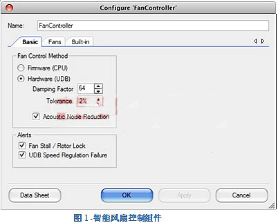 風(fēng)扇會不準(zhǔn)確,要經(jīng)常維護,通常,根據(jù)特定PWM周期反饋的RPM速度會有+ / - 10%或更多的錯誤。對于一個閉環(huán)回路,硬件控制系統(tǒng),設(shè)計人員可以輕易獲得并維持1%精度的RPM速度,沒有很高的延時,如果是固件實現(xiàn),那么會導(dǎo)致難聽的風(fēng)扇振動聲音。此外,風(fēng)扇相對于PWM占空比調(diào)整反應(yīng)也會變慢。為了減少下沖和過沖數(shù)量,可以引入快速硬件控制系統(tǒng),如果沒有糾正也會導(dǎo)致難聽的振動聲音,還應(yīng)該使用衰減系數(shù)。例如,賽普拉斯發(fā)布了智能風(fēng)扇控制組件和應(yīng)用筆記,使用的是PSoC器件和PSoC Creator軟件,實現(xiàn)了上面討論的硬件控制風(fēng)扇管理系統(tǒng)。在這個例子中,工程師可以定制自己的風(fēng)扇控制方案,只需要簡單的設(shè)置系統(tǒng)參數(shù),如衰減系數(shù)、容限、控制類型,在這個組件中,進而配置適當(dāng)?shù)目删幊踢壿嬇c固件API調(diào)用(參閱下文圖1)。