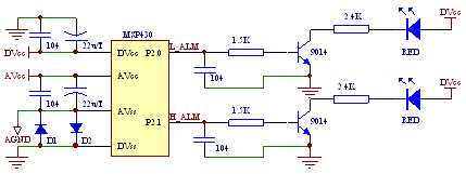 那么,如何利用MSP430?其方案又會是怎樣的呢?其實ADC12模塊的通道10對芯片的溫度進行測量,當(dāng)測量溫度高于或者低于預(yù)設(shè)告警值時,便通過I/O端口的輸出來驅(qū)動LED,顯示告警狀態(tài)。芯片在整個過程中處于低功耗模式。本系統(tǒng)的原理比較簡單,上圖給出了相應(yīng)的原理圖。