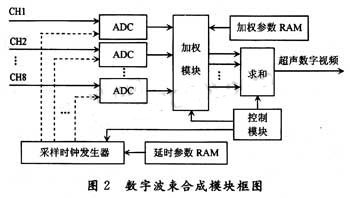 對(duì)于具有128陣元和32收發(fā)通道的超聲探頭,在進(jìn)行32路AD轉(zhuǎn)換后,將其分為4組,每組8路接收通道,每組用一片F(xiàn)PGA實(shí)現(xiàn),在該FPGA內(nèi)首先進(jìn)行接收延時(shí)和動(dòng)態(tài)聚焦再進(jìn)行加權(quán)求和,其后再進(jìn)行組間的求和產(chǎn)生超聲數(shù)字視頻信號(hào)。每一組的系統(tǒng)框圖如圖2所示: