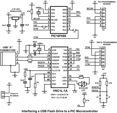 在PIC引腳2和3之間接入一個(gè)20MHz晶振可在其UART接口獲得高達(dá)115200bit/s波特率,而使用內(nèi)部8MHz振蕩器只能獲得最高9600bit/s波特率,因此加接晶振可提高系統(tǒng)性能。PIC的IO引腳RC2和RC3都被固件使用,以模擬與VNC1LUART連接的RTS/CTS握手信號(hào)。系統(tǒng)由PIC上的固件控制,數(shù)據(jù)傳輸則由PIC發(fā)出的指令控制,該指令由Vinculum上的標(biāo)準(zhǔn)固件進(jìn)行解釋。雖然說(shuō)起來(lái)很簡(jiǎn)單,但完成設(shè)計(jì)還有其他一些工作要做,例如器件還需要電源、控制時(shí)鐘的晶振以及編程。