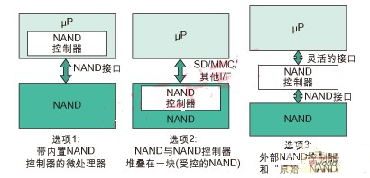 如果平臺(tái)中使用了帶完整NAND接口和控制器的微處理器,設(shè)計(jì)師通常傾向于第一種選擇。大多數(shù)當(dāng)代的微處理器即使支持NAND的話,通常也只支持較低密度的SLC NAND存儲(chǔ)器。
