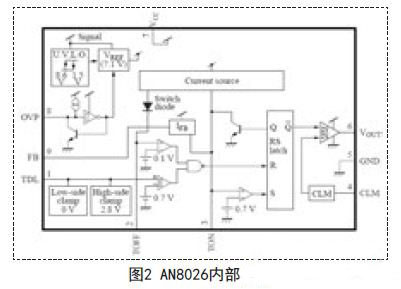 AN8026為松下公司開(kāi)發(fā)的反激式單端輸出RCC型準(zhǔn)諧振軟開(kāi)關(guān)驅(qū)動(dòng)控制器,封裝為SIP 9腳封裝,各個(gè)腳號(hào)的定義如表1所示,內(nèi)部框圖如圖2所示,其特點(diǎn)如下: