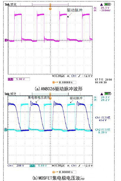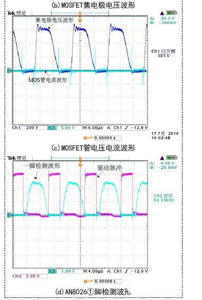 根據(jù)電路原理圖設(shè)計(jì),利用軟件AltiumDesigner Summer 09繪制PCB,并調(diào)試樣機(jī),圖4所示為軟開(kāi)關(guān)電源實(shí)驗(yàn)波形。