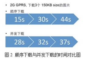 第二,并發(fā)下載技術(shù)。在GPRS環(huán)境下,以下載三張150K的圖片為例,順序下載需要44S,而在并發(fā)下載的情況只需要37S,減少了7S的時間。