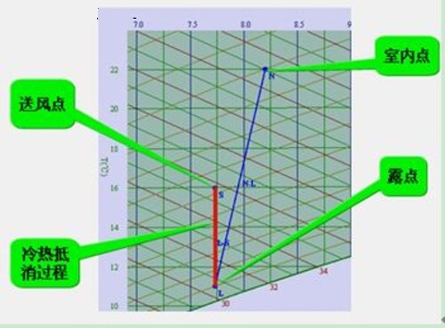 由圖中所示,室內(nèi)機既承擔(dān)機房內(nèi)的溫度也承擔(dān)機房內(nèi)濕度,勢必會造成冷熱抵消過程,見紅色過程線,以100KW的機組為例,最大冷熱抵消量為9kw。