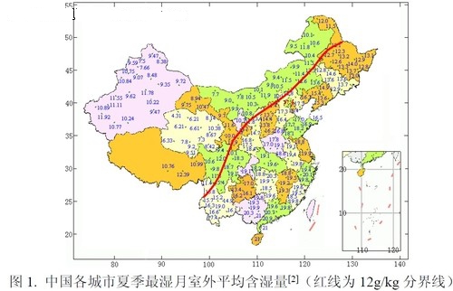 ▲圖3.中國各城市夏季最濕月室外平均含濕量[2]