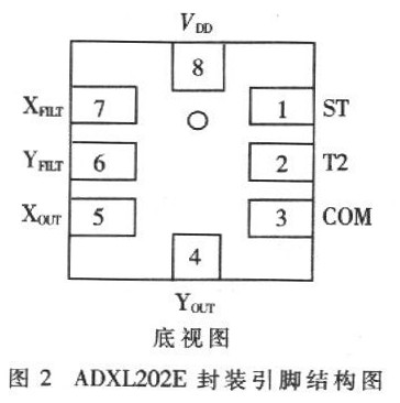 ADXL202的封裝形式為L(zhǎng)CC-8,其封裝和引腳的示意圖如圖2所示。