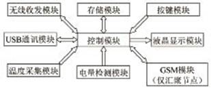 根據(jù)系統(tǒng)要求,溫度傳感器網(wǎng)絡(luò)包括遠(yuǎn)程控制中心和智能節(jié)點(diǎn)。遠(yuǎn)程控制中心用于發(fā)起數(shù)據(jù)采集命令,智能節(jié)點(diǎn)用以實(shí)現(xiàn)信息的采集、數(shù)據(jù)處理以及傳輸功能,其結(jié)構(gòu)組成如圖1所示,主要由控制模塊、無(wú)線收發(fā)模塊、通訊模塊、溫度采集模塊、存儲(chǔ)模塊、電量檢測(cè)模塊、按鍵模塊、液晶顯示模塊以及GSM模塊等組成。依據(jù)實(shí)際應(yīng)用背景,在所設(shè)計(jì)的溫度傳感器網(wǎng)絡(luò)中,普通節(jié)點(diǎn)首先通過(guò)無(wú)線射頻將所測(cè)溫度數(shù)據(jù)傳輸給匯聚節(jié)點(diǎn),然后匯聚節(jié)點(diǎn)通過(guò)GSM模塊將數(shù)據(jù)傳給遠(yuǎn)程控制中心。