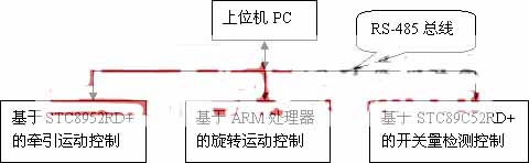 牽引床的總體設(shè)計采取分布式控制體系,如圖1所示。計算機作為上位機通過RS-485總線與三個嵌入式控制器(下位機)組成分布式總線網(wǎng)絡(luò)實現(xiàn)對床體運動的控制。計算機實現(xiàn)系統(tǒng)總體操作控制界面。系統(tǒng)復(fù)雜的控制任務(wù)被分解為三部分,分別由三個嵌入式控制器并行實時執(zhí)行完成。其中,牽引運動及牽引力的檢測與控制由一片STC89C52RD+單片機完成;三個旋轉(zhuǎn)運動的角度檢測及控制由Samsong公司的32位ARM核RISC處理器S3C44B0X處理;床體上各類限位開關(guān)等開關(guān)量檢測及輸出則由另一片STC89C52RD+實現(xiàn)。